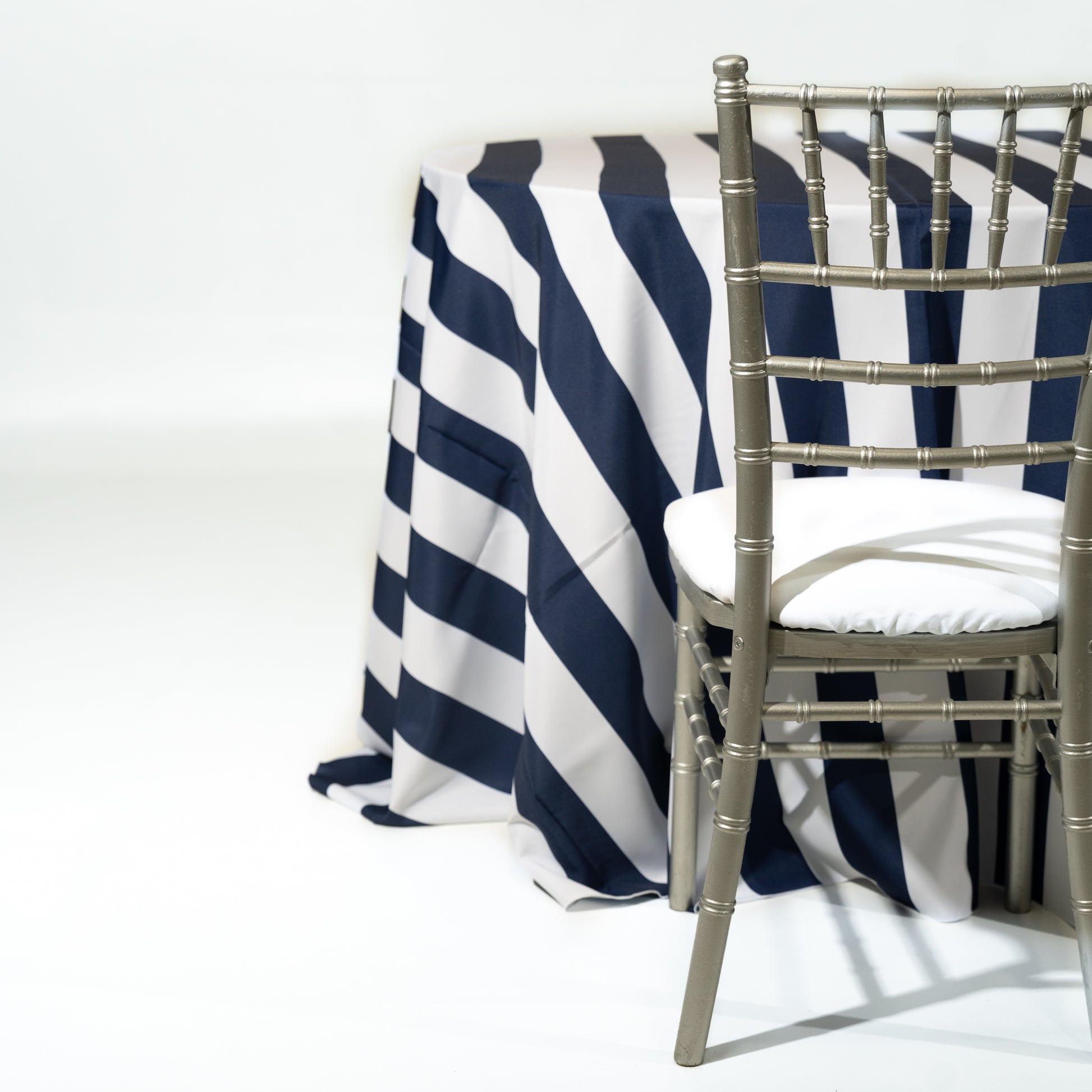 The Awning Navy 126” round linen offers a bold, clean look for banquets and receptions. Wrinkle-resistant and event-ready.